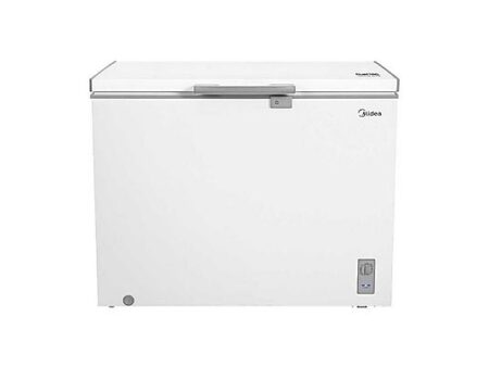 Congelador horizontal Midea de 285L con congelación rápida, control mecánico y apertura superior. Clase energética E y diseño independiente en blanco.