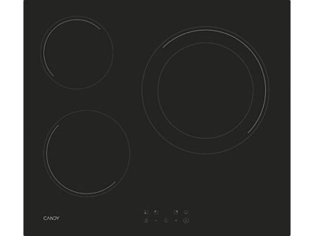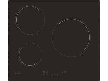 Placa vitrocerámica Candy CH63DCC, 3 zonas High-Light, 59 cm, negra, con panel táctil, bloqueo infantil, indicador de calor residual y diseño integrable. Ideal para cocción rápida, precisa y segura.