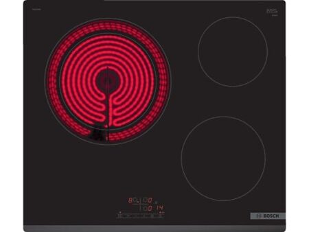 Placa vitrocerámica Bosch PKK631BB8E, 3 zonas, 60 cm, negra, TouchSelect, 17 niveles de potencia, zona grande 28 cm, bloqueo infantil y apagado automático.
