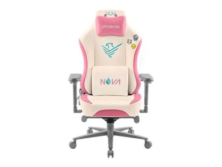 Silla Gaming Phoenix Nova Cream Edition en color crema con reposabrazos 4D, cojín lumbar viscoelástico y cojín cervical magnético. Diseño ergonómico con base metálica resistente.
