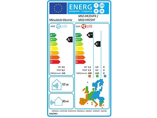 Aire Acondicionado Split 1×1 Mitsubishi Electric MSZ-HR25VF Inverter 2.5 kW (2150 fg/h) A++/A+ Frío/Calor, Blanco, hasta 22 m²
