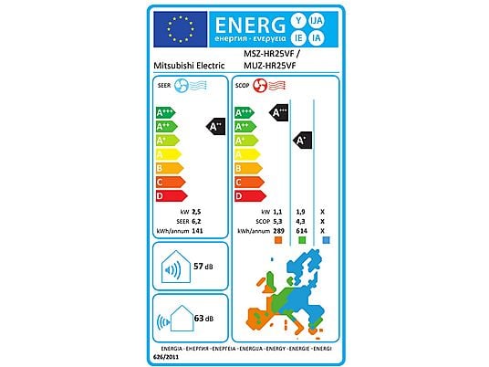 Aire Acondicionado Split 1x1 Mitsubishi Electric MSZ-HR25VF Inverter 2.5 kW (2150 fg/h) A++/A+ Frío/Calor, Blanco, hasta 22 m²