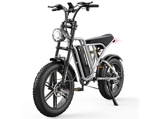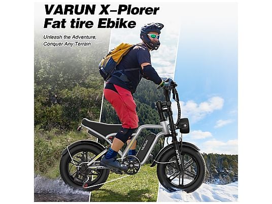 Bicicleta eléctrica de montaña VARUN X-Plorer 20″ Plata con motor 250W, batería 48V 13Ah, doble suspensión, 7 velocidades Shimano y neumáticos anchos 4.0″. Potencia, control y estilo para ciudad y off-road.