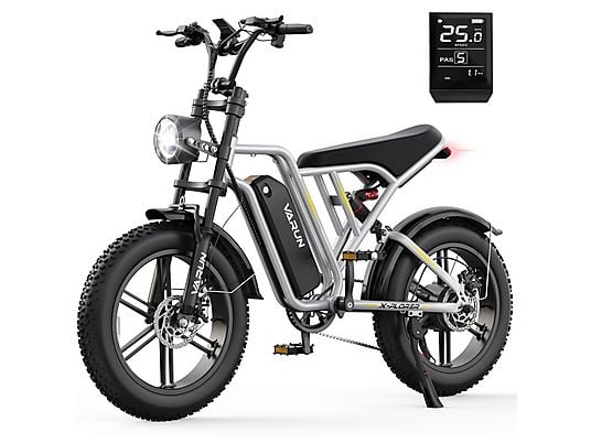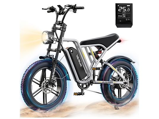 • Bicicleta eléctrica de montaña VARUN X-Plorer 20" Plata – Motor 250W, Batería 48V 13Ah, Doble Suspensión, 7 Velocidades Shimano, Neumáticos Anchos 4.0"