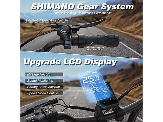 Equipada con transmisión Shimano de 7 velocidades y frenos de disco mecánicos, la X-Plorer asegura cambios suaves y frenado confiable en cualquier situación. Su cuadro de acero al carbono reforzado soporta hasta 150 kg, combinando durabilidad con estilo robusto. La pantalla LCD central muestra velocidad, nivel de batería y asistencia al pedaleo, facilitando el control de cada recorrido.