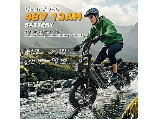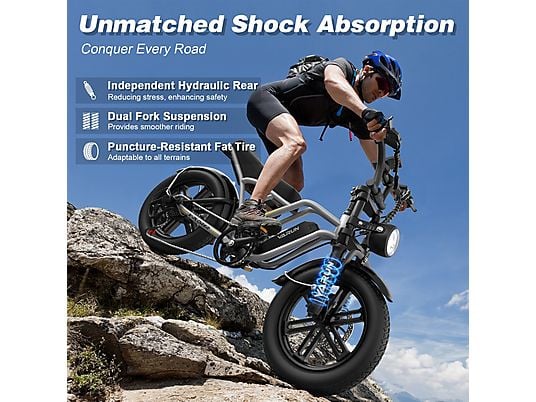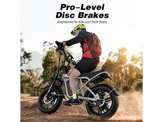 Su diseño tipo dirt bike con neumáticos anchos de 20″ × 4.0″ garantiza un agarre superior y amortiguación en arena, grava y caminos urbanos. El sistema de doble suspensión (delantera y trasera) mejora la estabilidad y reduce las vibraciones en terrenos irregulares, ofreciendo una conducción cómoda y segura.