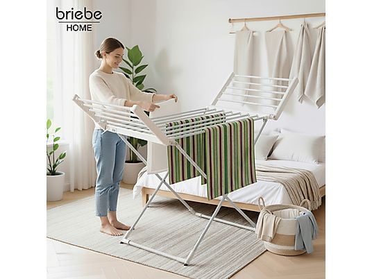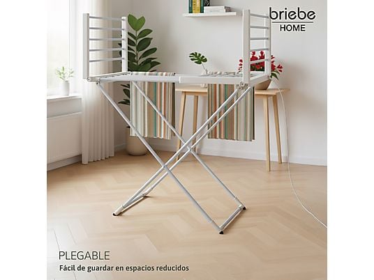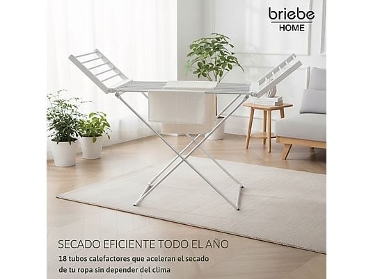 Tendedero eléctrico BRIEBE CD1183 plegable con 18 barras calefactoras, 220W de bajo consumo, ideal para secado rápido en interiores.