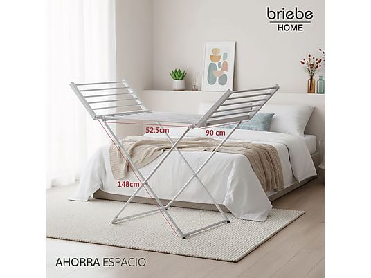 Su diseño plegable y compacto permite guardarlo fácilmente en espacios reducidos como armarios o detrás de puertas. Aun así, cuando está desplegado, ofrece una amplia superficie de secado para múltiples prendas.