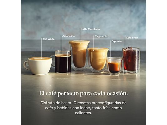 Además, la función Cold Extraction Technology facilita preparar bebidas frías como cold brew en menos de 5 minutos. El depósito de agua extraíble de 1,7 L, los accesorios incluidos (jarrón de leche, guía de dosificación, alfombrilla y herramientas de limpieza) y los programas automáticos para limpieza y descalcificación hacen que su uso diario sea elegante y sin complicaciones.