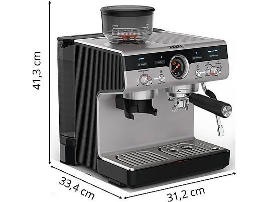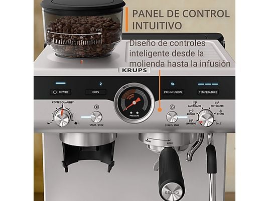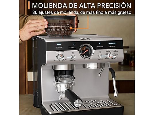 Cafetera express Krups Precision XP801T con molinillo integrado, 30 ajustes de molienda, 15 barras, Thermoblock y boquilla de vapor profesional. Capacidad de 3.5 L e inoxidable.