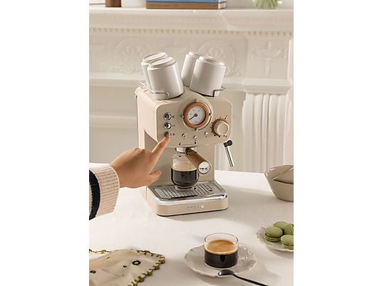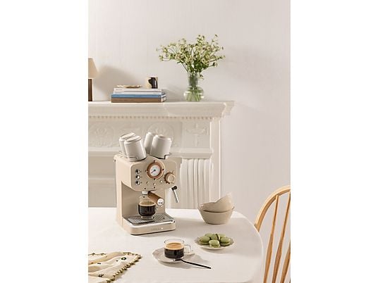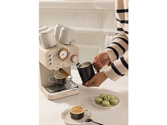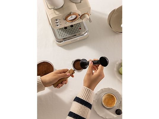 Cafetera express CREATE Thera Retro con 15 bar, 1100 W, brazo de doble salida y vaporizador orientable. Compatible con café molido y monodosis E.S.E. para espresso, cappuccino y más.
