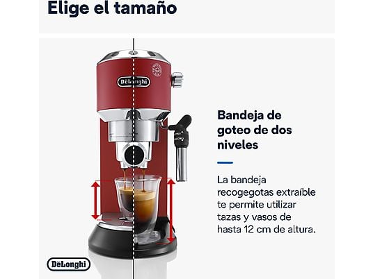 Cafetera express De’Longhi Dedica roja con 15 bares, sistema Thermoblock y vaporizador. Compacta, potente y perfecta para espresso y cappuccino.