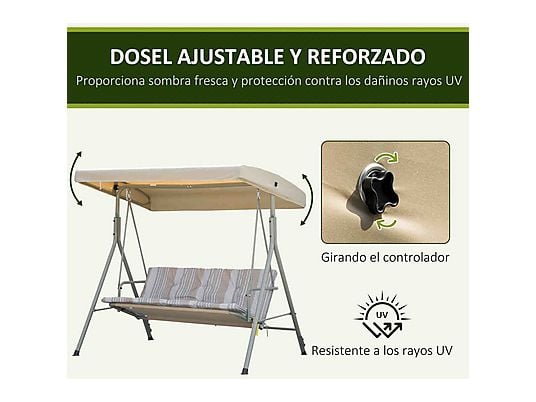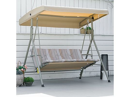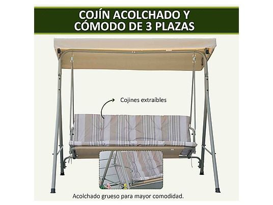 Columpio de jardín OUTSUNNY 3 plazas con toldo ajustable, estructura de acero y cojín acolchado extraíble. Resistente y cómodo para exterior.