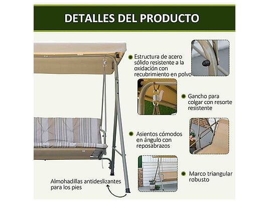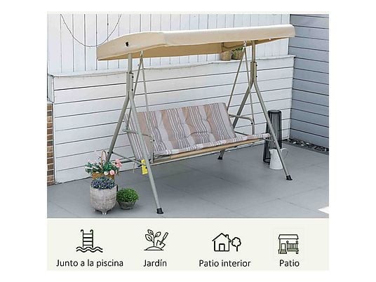 Disfruta del aire libre con total comodidad gracias al columpio de jardín OUTSUNNY 3 plazas. Diseñado para ofrecer resistencia, confort y protección solar, es ideal para jardines, terrazas o patios.