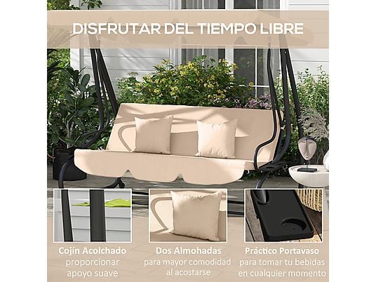 Columpio de jardín OUTSUNNY 3 plazas con toldo, bandejas laterales y cojín acolchado. Resistente, cómodo y perfecto para exterior.