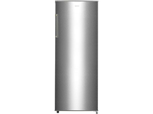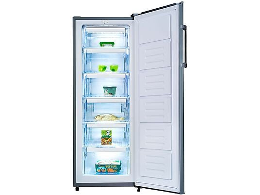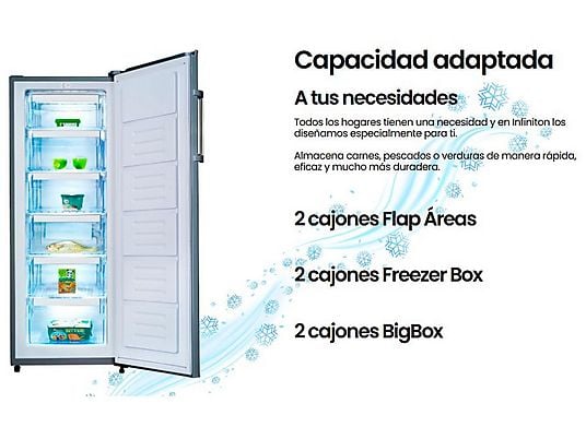 Congelador vertical INFINITON de 172 L en acabado inox, con 1 puerta reversible, 4 estrellas, cajones BigBox y función Fast Freezing. Silencioso, eficiente y práctico para cualquier hogar.
