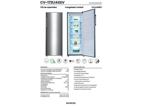 El Congelador Vertical INFINITON CV-172L14XEV combina eficiencia y diseño moderno en acero inoxidable (Inox). Con un volumen total de 172 litros y 1 puerta reversible, ofrece espacio suficiente para almacenar alimentos de manera organizada: 1 cajón flap, 3 cajones Freezer Box y 2 cajones BigBox de gran capacidad.