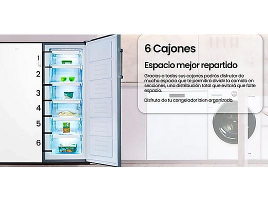 Ideal para hogares que buscan un congelador práctico y confiable, cumple con la certificación CE y tiene clase energética E según la normativa UE 2017/1369. Es perfecto para mantener alimentos frescos y congelados de manera eficiente, con un estilo moderno gracias a su acabado Inox.