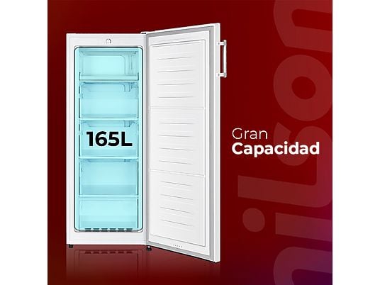 Congelador vertical NILSON de 165 L en color blanco, 1 puerta reversible, 4 estrellas, múltiples cajones y bandeja para organizar tus alimentos de manera eficiente y silenciosa.