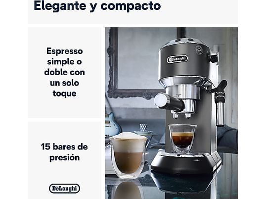 Cafetera express De’Longhi Dedica EC685.BK de 15 bares y 1300W con sistema Thermoblock. Diseño compacto, compatible con café molido y monodosis ESE, con vaporizador para cappuccino y función de 2 tazas.