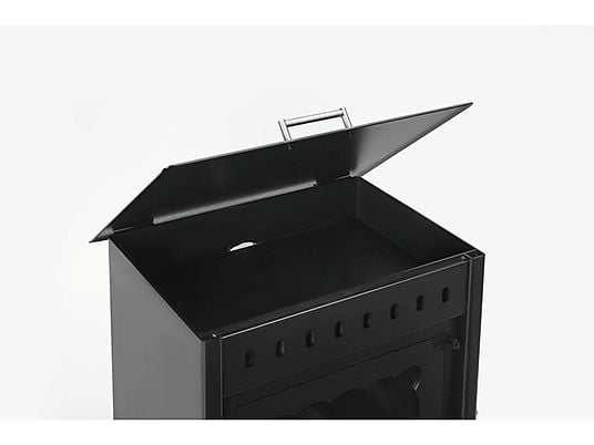 Como valor diferencial, incorpora una puerta lateral de carga, que reduce notablemente la salida de humos al introducir la leña, mejorando la experiencia de uso. Además, dispone de un pequeño horno superior con tapa, perfecto para calentar o cocinar alimentos de forma tradicional aprovechando el calor residual.