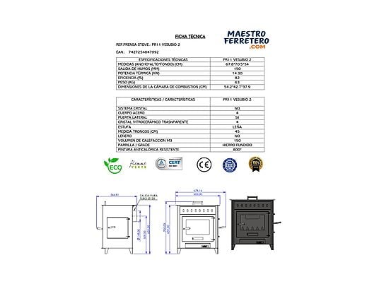 La estufa de leña Maestro Ferretero VESUBIO 2 de 14,3 kW combina potencia, resistencia y funcionalidad en un diseño tradicional pensado para ofrecer un alto rendimiento térmico y una gran comodidad de uso.
