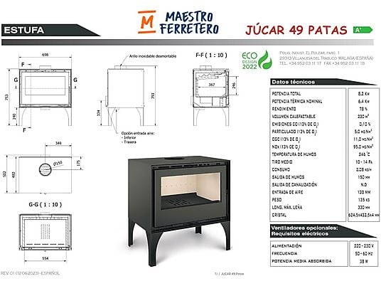 Estufa de leña TJ Jucar 49 Patas, 6,4 kW, acero de alta calidad, rendimiento 85%, ecológica, para 88 m². Ideal para calefacción eficiente, diseño con patas y cristal limpio.