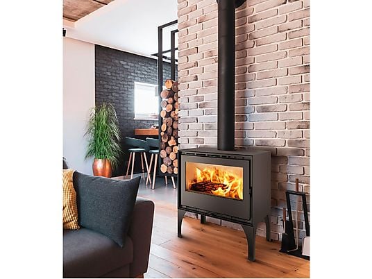 La estufa tiene un diseño práctico con patas, que facilita su instalación en diferentes tipos de espacios. Además, la toma de aire puede ser por la parte trasera o inferior, adaptándose a tus necesidades. Su salida de humos de 150 mm y el sistema de cristal limpio hacen que su mantenimiento sea sencillo.