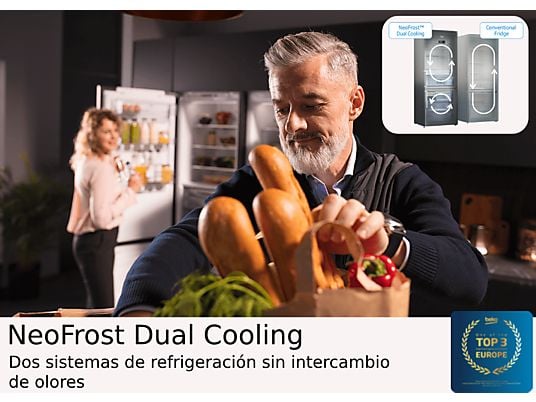 El sistema NeoFrost Dual Cooling incorpora dos circuitos de refrigeración independientes, evitando la mezcla de olores entre frigorífico y congelador y manteniendo niveles de humedad y temperatura óptimos.
