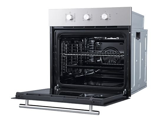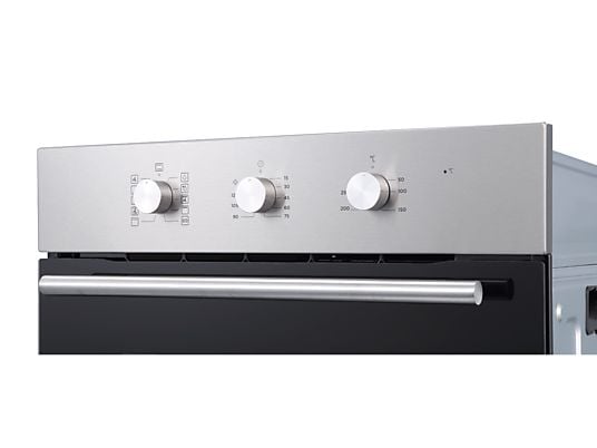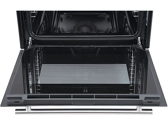 El horno cuenta con esmalte fácil de limpiar que simplifica el mantenimiento y mandos retráctiles que crean un diseño minimalista cuando no está en uso. Las bandejas y parrilla incluidas permiten un uso inmediato y cómodo. La puerta del horno mantiene una temperatura segura, evitando riesgos de quemaduras durante su uso.