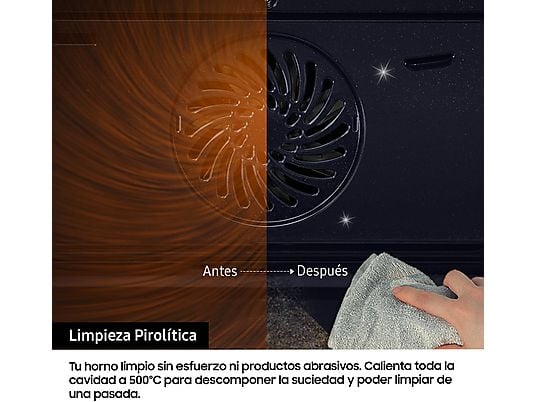 El sistema pirolítico calienta el horno hasta 500 °C, descomponiendo grasa y restos de alimentos en ceniza. Después solo tendrás que limpiar con un paño húmedo.