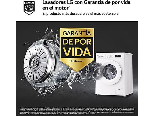 Lavadora LG F4X1009NWK de 9kg con 1400rpm, motor AI Direct Drive™, conectividad ThinQ™ y 10 programas de lavado. Eficiencia energética Clase A, rendimiento silencioso y cuidado superior para tu ropa.