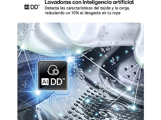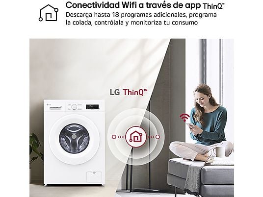 El interior de la lavadora está fabricado 100 % en acero inoxidable con 6 palas bateadoras, garantizando un lavado homogéneo y delicado. Gracias a la conectividad Wi-Fi y la app LG ThinQ™, puedes controlar la lavadora desde tu móvil, descargar nuevos programas y recibir asistencia técnica de forma rápida y sencilla.