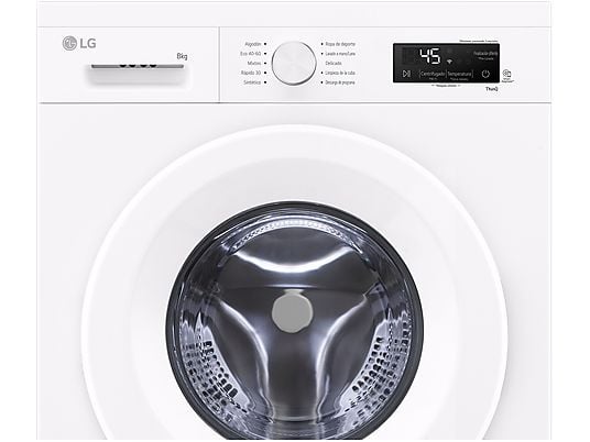 Lavadora frontal LG F4X1008NWH de 8 kg y 1400 RPM con 10 programas, motor AI Direct Drive™ y conexión ThinQ™. Interior acero inoxidable, lavado delicado y garantía de por vida en el motor. Blanco Marfil.