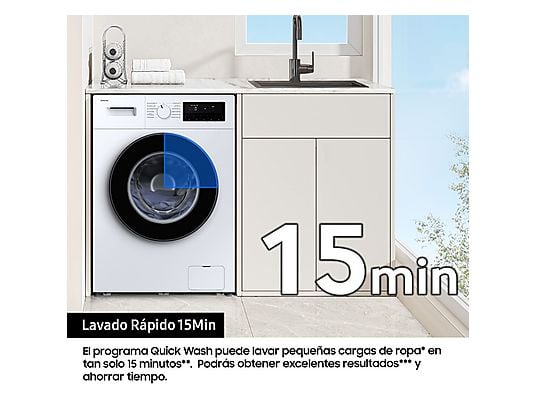 La lavadora Samsung WW10FG5U34AEEC de 10 kg y 1400 rpm incorpora AI EcoBubble™ para una limpieza profunda en agua fría. Con 16 programas y tecnología Super Speed para ciclos rápidos, elimina 99,9% de bacterias y alérgenos con la función de vapor. Ahorra hasta un 70% de energía con el modo AI Energy y controla la lavadora desde la app SmartThings.