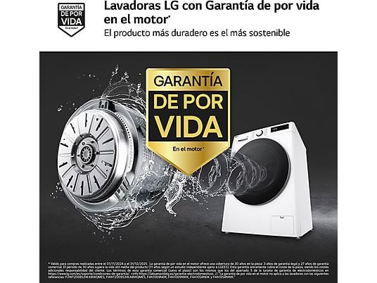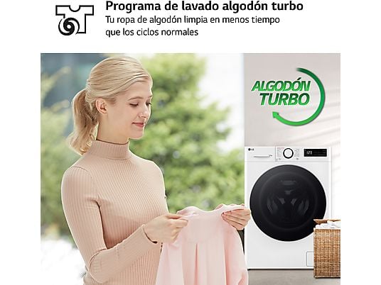Lavadora LG F4X1009NWK de 9kg con 1400rpm, motor AI Direct Drive™, conectividad ThinQ™ y 10 programas de lavado. Eficiencia energética Clase A, rendimiento silencioso y cuidado superior para tu ropa.