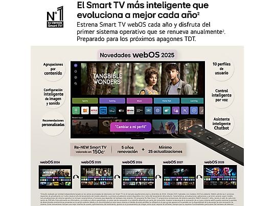 El sistema operativo webOS de LG garantiza una experiencia Smart TV fluida e intuitiva que evoluciona con actualizaciones anuales, y el Magic Remote con botón de IA permite controlar por voz tanto la televisión como dispositivos del hogar.