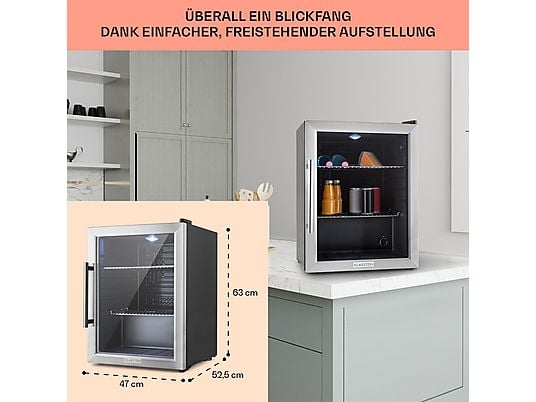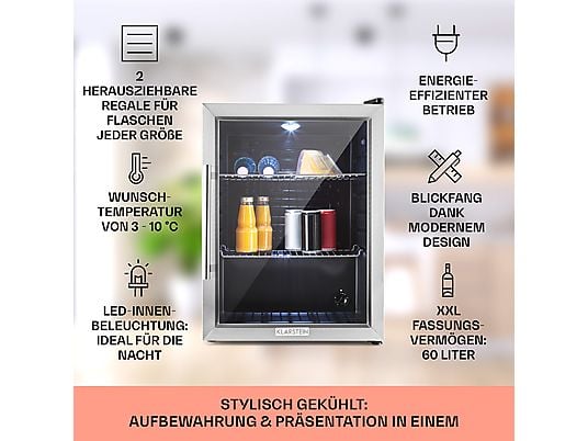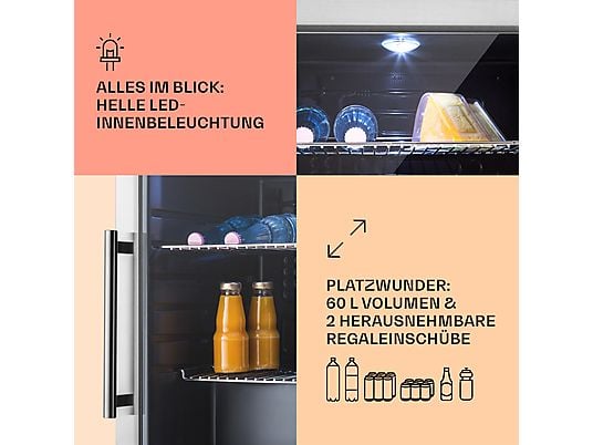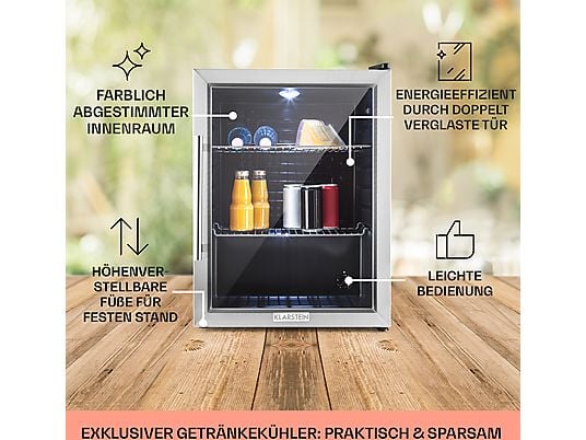 Mini Nevera Klarstein Beersafe XL 60L para Bebidas, Puerta de Cristal, Iluminación LED, Temperatura Regulable 3-10°C, Acero Inoxidable