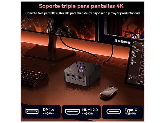 Gracias a HDMI, DisplayPort y Type-C, el mini PC soporta tres pantallas 4K simultáneas, ideal para: