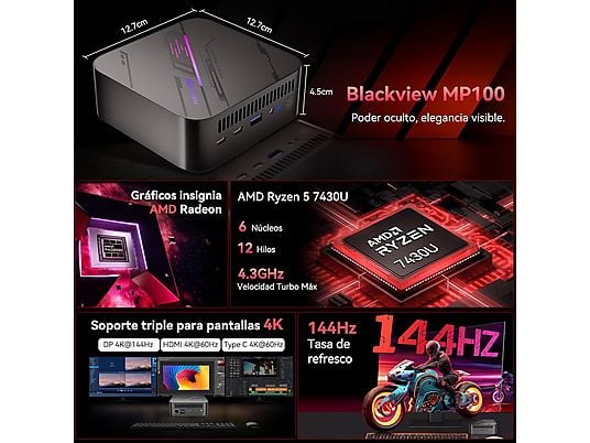 • Mini PC Blackview MP100 – AMD Ryzen 5 7430U 6C/12H hasta 4.3GHz, 16GB RAM DDR4, 512GB SSD M.2, Radeon RX Vega 7, Triple 4K, WiFi 6, USB 3.2, Type-C, Bluetooth 5.2, Windows 11 Pro, Negro