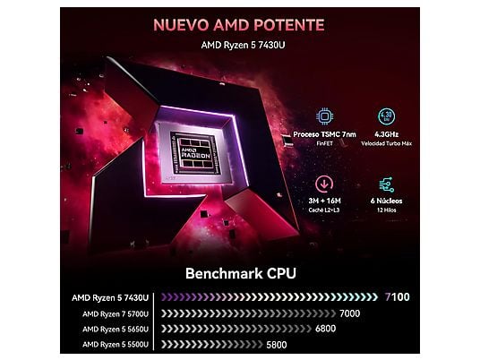 Incorpora AMD Ryzen 5 7430U con 6 núcleos, 16 hilos y hasta 4.3 GHz, basado en arquitectura ZEN 3, ofreciendo un aumento del 35% en rendimiento frente a generaciones anteriores. Perfecto para: