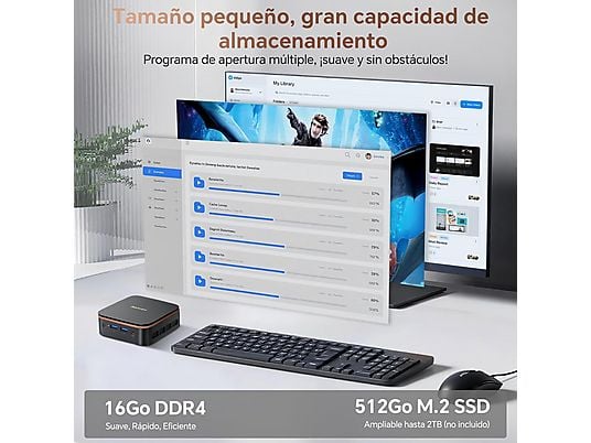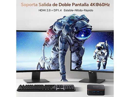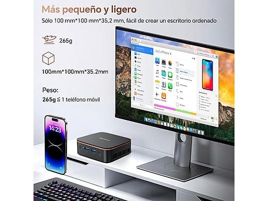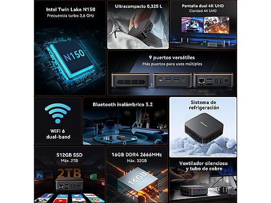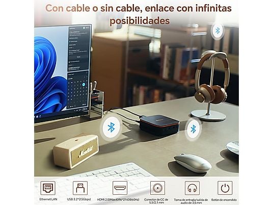 Gracias a sus gráficos Intel UHD Graphics, permite conectar dos monitores 4K simultáneamente mediante HDMI, aumentando la productividad. Su tamaño ultracompacto de solo 390 g, conectividad completa y sistema Windows 11 Pro lo convierten en una solución ideal para escritorios modernos, oficinas o centros multimedia domésticos.