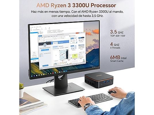 Este mini ordenador integra el procesador AMD Ryzen 3 3300U, con 4 núcleos y frecuencia turbo de hasta 3.5 GHz, proporcionando potencia suficiente para ejecutar múltiples aplicaciones de forma simultánea.