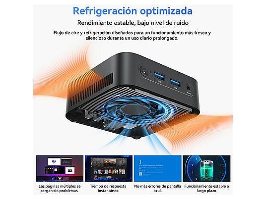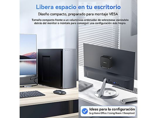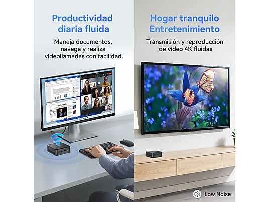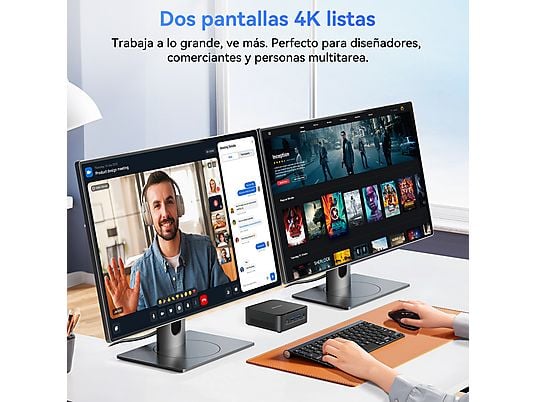 Gracias a sus gráficos Intel UHD Graphics, permite conectar dos monitores 4K simultáneamente mediante HDMI, aumentando la productividad. Su tamaño ultracompacto de solo 390 g, conectividad completa y sistema Windows 11 Pro lo convierten en una solución ideal para escritorios modernos, oficinas o centros multimedia domésticos.
