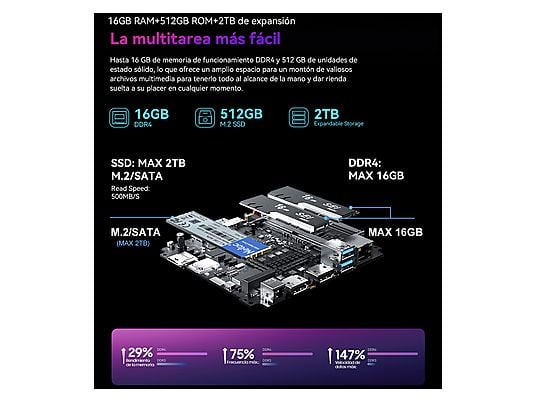 También permite ampliar el almacenamiento hasta 2TB mediante SSD de 2,5”, ideal para usuarios que necesitan mayor capacidad.