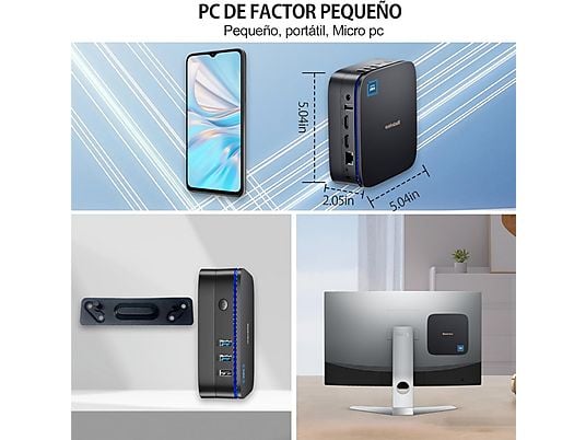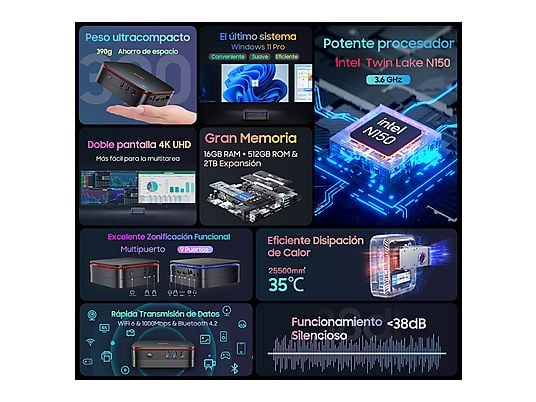 Gracias a sus gráficos Intel UHD Graphics, permite conectar dos monitores 4K simultáneamente mediante HDMI, aumentando la productividad. Su tamaño ultracompacto de solo 390 g, conectividad completa y sistema Windows 11 Pro lo convierten en una solución ideal para escritorios modernos, oficinas o centros multimedia domésticos.