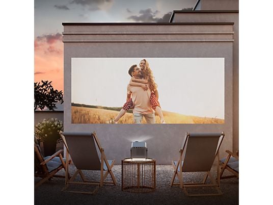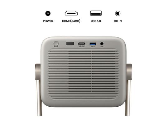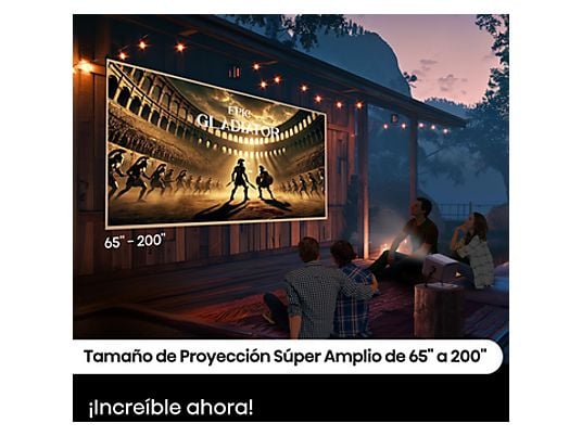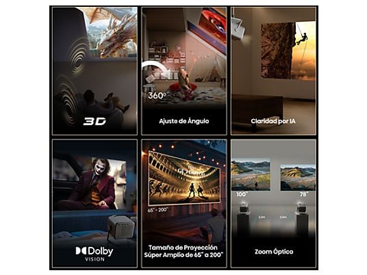 El Samsung The Freestyle SP-LFF3CLAXXXE es un proyector portátil Full HD con Smart TV, capaz de proyectar pantallas de hasta 100 pulgadas en cualquier superficie gracias a su diseño rotatorio 360° y calibración automática. Incluye WiFi, Bluetooth, HDMI, Gaming Hub, SmartThings y altavoz integrado, todo en un dispositivo compacto de solo 800 g.