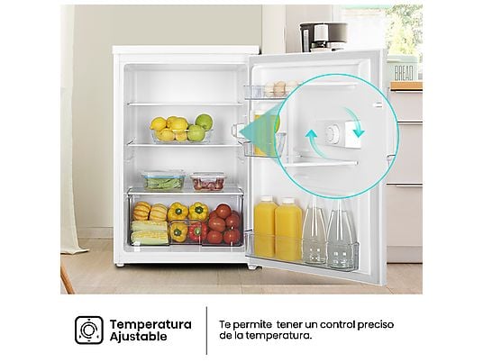 Con 133 litros de capacidad, ofrece espacio suficiente para conservar alimentos y bebidas de forma organizada, manteniendo un diseño compacto de 84,5 cm de altura que se adapta fácilmente a cualquier cocina.