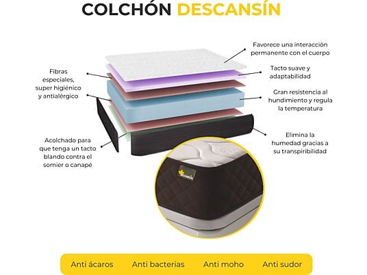 El colchón visco-soft gel cuenta con estructura microcelular que proporciona transpiración constante y ventilación óptima, asegurando un ambiente fresco y seco durante toda la noche. Su núcleo HR de alta densidad garantiza soporte uniforme y resistencia al hundimiento, mientras que sus cuatro capas controlan la sudoración y aportan suavidad. Los tejidos especiales protegen contra bacterias, ácaros y hongos, siendo apto para personas alérgicas. La capa de gel y la superficie Stretch Silver se adaptan al cuerpo, asegurando independencia de lechos y reducción de movimientos molestos.