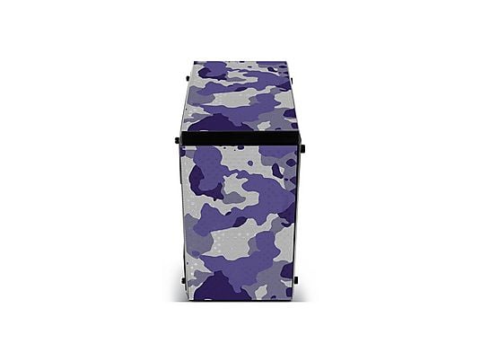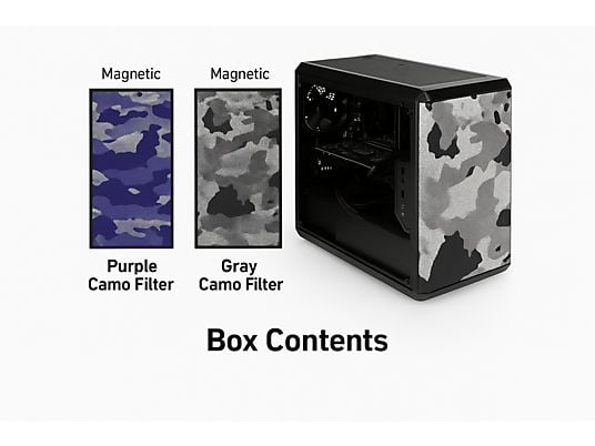Chasis de aluminio con filtros intercambiables azul y negro, refrigeración por aire silenciosa y eficiente, tamaño compacto (47 × 43 × 27 cm), ideal para escritorio o setup gaming.